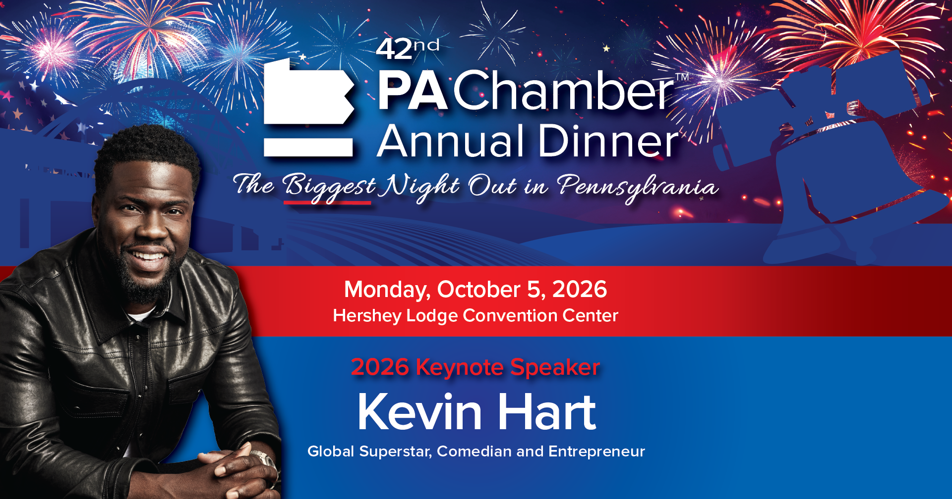 We’re thrilled to announce that global superstar, comedian, and entrepreneur Kevin Hart will serve as the keynote speaker at the PA Chamber’s top signature event on Monday, October 5, 2026, at the Hershey Lodge. As we celebrate America250, we’re combining international star power with Pennsylvania pride—welcoming a Philly native whose rose to the highest levels of entertainment and business back to the Commonwealth to headline The Biggest Night Out in Pennsylvania.